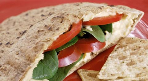 • Cut whole wheat pita in half. Spread 3 tablespoons hummus in each pocket. Stuff with tomato and cucumber slices and baby spinach leaves. Sprinkle stuffing with a flavored vinegar.