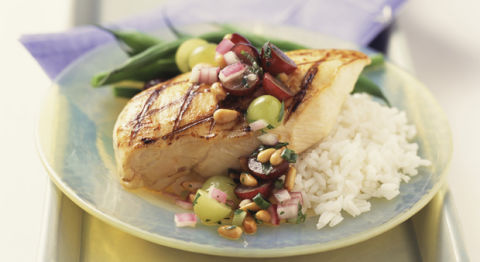 • Sweet Chicken with Grapes: In nonstick skillet with 1 teaspoon olive oil, cook 5 ounces boneless, skinless chicken breast; 1 tablespoon minced shallots; 1/4 teaspoon thyme; 1/4 teaspoon salt; and a dash of pepper until chicken is browned on both sides and loses pink color throughout. Place chicken on plate. Add 3/4 cup halved seedless grapes and 1/4 cup white wine to skillet; boil 1 minute. Pour over chicken.